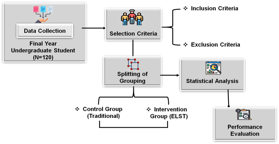 Research used a controlled design, with 120 final-year undergraduate nursing students separated into two groups: an intervention group (N=60) that occupied with the Emergency and Life Support Training (ELST) module before traditional exercise and a control group (N=60) that received only traditional training. Figure 1 develops the methodology flow.