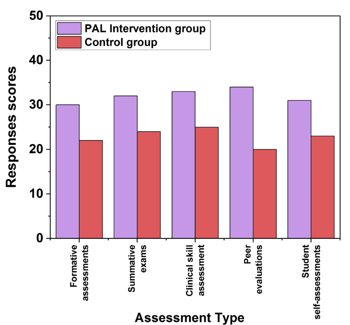 To analyse the competence growth accurately, multiple assessment methods were conducted. Here, specifically five assessment methods were performed on the medical students. To provide both educators and students insight into their development, these evaluations have been carried out at different times during the learning process that serves as instructional resources. Quizzes, short assignments, and classroom activities are prime instances of formative assessments in the context of PAL that assist students in measuring their understanding and improving their abilities before finals. After a course, like a semester, summative exams are utilized for evaluating the overall achievement of students. These tests measure the way learners have understood the topic and usually contribute toward their final score. Typically, written or practical assessments examined the students’ clinical-theoretical expertise level in PAL. The students can evaluate each other’s performance through peer evaluations, which usually take place in collaboration or cooperative situations. Students who engaged in peer tutoring within the framework of PAL had the opportunity to assess their colleagues’ clinical expertise and efficacy as teachers. These assessments offer insight into teaching effectiveness and assist in identifying areas of strength and potential development. To examine students’ practical skills in actual or simulated clinical environments, clinical assessments are carried out. To ensure that students can convert their theoretical knowledge into practical abilities, these tests are essential in medical education. Different assessments, including physical examinations, diagnoses, and real-world applications are the major techniques in clinical assessment. Self-assessments encourage the students to replicate on their learning, strengths, weaknesses, progress, and performance. The students can rate their clinical skills, theoretical knowledge, or involvement with peer teaching as part of their self-assessments. To gain more self-awareness and responsibility, these assessments are vital. Figure 1 illustrates the response score of the students.
