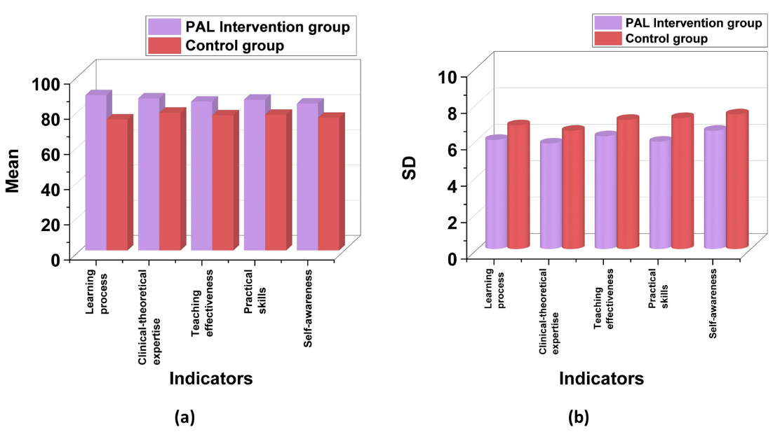 The findings of the Mann-Whitney U and ANCOVA tests confirmed the intervention’s greater effect on significant performance indicators. The medical competitiveness of students had substantially enhanced as evidenced by the greatest F-statistics and lowest p-values for the learning process and clinical-theoretical expertise. Further, the consistent performance and the strong effects were obtained by the lowest SD and η² scores. Mann-Whitney U test findings reinforced these findings, with teaching effectiveness and practical skills emerging as the most effective as demonstrated by the mean and sum of ranks. The effectiveness of the intervention is demonstrated by the lowest U and p-values, which indicate significant group differences. These findings underscored the enhanced learning outcomes facilitated by PAL, particularly in teaching effectiveness and practical skills.