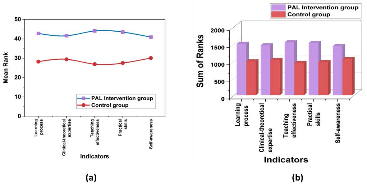 The highest mean rank of 44,1 and sum of ranks (1544,0) of teaching effectiveness in the intervention group, with the lowest p-value (0,0005), indicate a highly significant improvement. Similarly, practical skills exhibited a mean rank of 43,5 and the sum of ranks (1523,0), with a p-value of 0,0007, confirming its strong effectiveness. The decreased Mann-Whitney U values of 295,0 for teaching effectiveness and 305,0 for practical skills confirmed the noteworthy rank differences. Figure 3 (a) and (b) visualize the mean and sum of ranks.