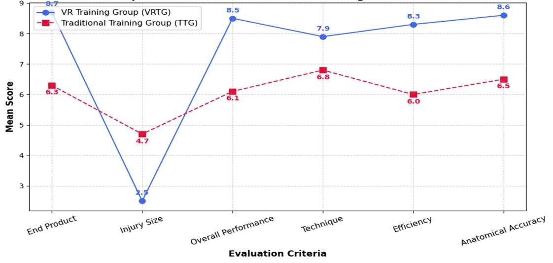 The medical students who performed their dissections of temporal bones in cadavers when using VRTG or TTG systems were examined in this research. Test results establish that VRTG supplies superior training performance when compared to TTG approaches during cadaveric temporal bone dissection. The VRTG performance effectiveness along with decreased patient injuries signifies that simulated interactive training environments enhance surgical precision. Standardization of skill acquisition becomes more successful through VR-based training because of its demonstrated high inter-rater reliability and evaluation consistency. The VRTG functions well as a surgical education tool because it enhances evaluation consistency, which in turn reduces performance assessment variability. The findings validate that VR simulation contributes to medical education by delivering an organized educational experience that produces repeatable results while maintaining a high student interest level.