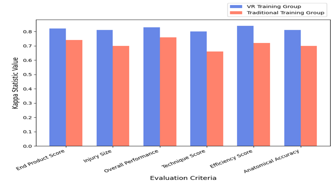 In this research, 155 medical students were assigned to participate in the VR Training Group (VRTG) (n = 85) or the Traditional Training Group (TTG) (n = 70) for training in temporal bone dissection. TTG practiced cadaveric dissection under the guidance of an instructor, while VRTG employed a specialized VR simulator that offered real-time feedback. To ensure a thorough comparison of training efficiency, statistical analysis was conducted using independent t-tests, Kappa Statistic, and Intra-Class Correlation Coefficient (ICC).