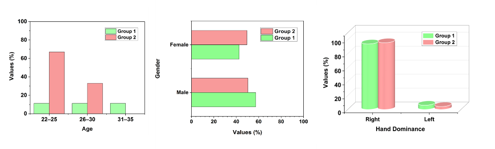 More participants (64,3 %) in group 1 were between the ages of 26 and 30 than in group 2, where the majority (67,0 %) was between the ages of 22 and 25. Both groups had a similar gender composition, with men making up 50,4 % of group 2 and 57,4 % of group 1. Prior experience differed greatly; for example, group 1 had more robotic experience (26,1 %) than group 2 (4,3 %), and 61,7 % of group 1 had laparoscopic experience compared to just 15,7 % in group 2.