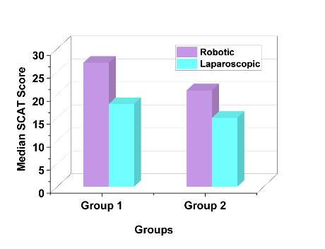 To compare the SCAT results with the robotic and laparoscopic groups, a Mann-Whitney U test was employed. The robotic group also possessed a higher median SCAT score in group 1 as well as group 2, reflecting increased operating capability with robot training as shown in figure 2 and table 2.