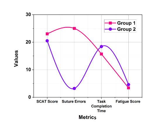 The performance measures show that group 1 had a higher median SCAT score (23,00) than group 2 (20,50), indicating more competency. Group 1 also had fewer suture errors (2,5 vs. 3,2) and finished activities quicker (15,7 vs. 18,4 minutes). Furthermore, group 1 reported lower fatigue levels (3,4 vs. 4,6), indicating improved physical comfort during training. These data emphasize surgical trainees' higher efficiency and lower fatigue compared to medical students.