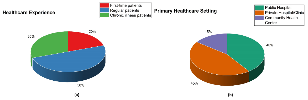 The exploration gathered information from 200 volunteers who experienced structured interviews using standardized tests for measuring trust and communication quality. Purposive sampling enabled the exploration to select participants whose healthcare backgrounds diversified among the population. The chosen participant sample consisted of patients who had experienced recent doctor visits so explorers could analyze current dynamics of trust and communication quality in medical settings. Table 1 describes the demographic data of variables. The distribution of participants by healthcare experience and primary healthcare setting is represented as (a) and (b) in figure 2.