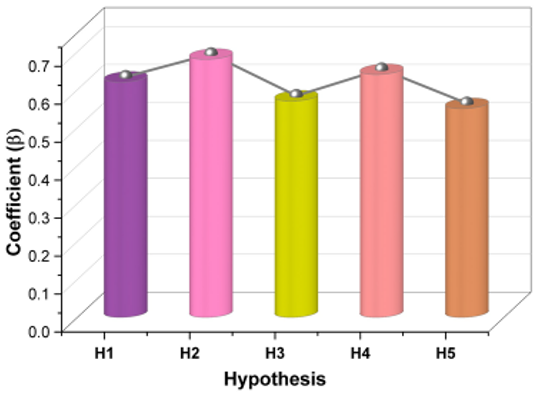 The doctor-patient relationship plays a pivotal role in healthcare outcomes, with trust and communication serving as foundational elements. The results indicate that all the predictor variables (H1 to H5) significantly affect the dependent variable, as their p-values are all less than 0,01. The strongest effect and explanatory power is that of H2 with a β-coefficient of 0,68 and an R² of 0,46, followed by H4 with a β of 0,64 and an R² of 0,41, and then H1 with a β of 0,62 and an R² of 0,38, both with high predictive correlations. H3 and H5 have comparatively weaker but significant effects, with β-coefficients of 0,57 and 0,55, and R² values of 0,33 and 0,30, respectively. The t-values ranging from 6,35 to 8,92 confirm the strength of the relationships, whereby H1 to H5 are significant in explaining variation in the dependent variable. Table 4 and figure 4 represent the variable using Regression Analysis.