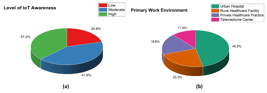 The exploration gathered data from 43 healthcare providers using both surveys and interviews that examined how IoT affects healthcare operational processes. The participants included members of healthcare staff who used IoT-driven healthcare solutions. The surveys collected numerical data about service efficiency, scalability and resource optimization methods, but the interviews gave qualitative information about implementation difficulties and advantages. The analysis of participant characteristics through demographic data enables explorers to properly determine IoT adoption relationships with healthcare efficiency, operational impact, and scalability. Table 1 describes the demographic data of variables. The distribution of participants by (a) level of IoT awareness and (b) primary work environment are represented in figure 2.