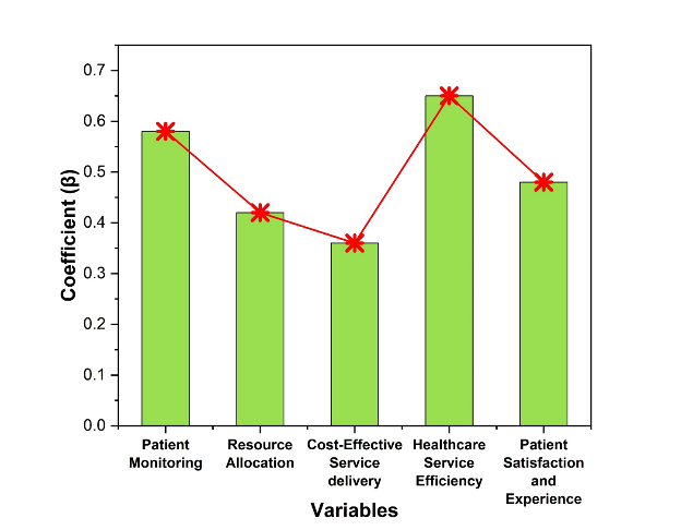 The results from the ANOVA outcomes indicate the statistical contribution of drivers powered by the IoT towards the scalability and performance of healthcare services. In particular, healthcare service efficiency has the highest F-value (10,8) with the lowest p-value (0,001), indicating its substantial contribution. This is followed by patient monitoring (F = 8,5, p = 0,002), which suggests its substantial contribution towards enhancing healthcare processes. Moreover, patient satisfaction and experience (F = 6,9, p = 0,006) and resource allocation (F = 7,3, p = 0,004) have substantial contributions, hence supporting the application of IoT in enhancing service quality. The last, through still statistically significant, is the cost-effective delivery of services (F = 5,2, p = 0,018). Overall, the results affirm that all factors under consideration contribute significantly towards enhancing healthcare improvements, hence supporting the effectiveness of IoT in enhancing service delivery and efficiency. Table 3 and figure 4 illustrate the variables using ANOVA.