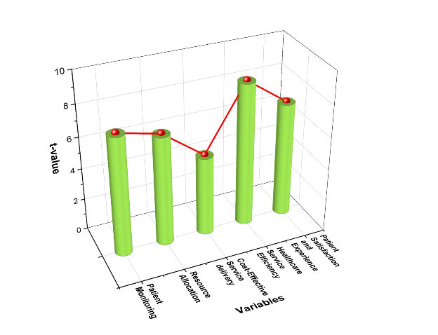The paired t-test shows significant improvements in healthcare performance metrics after the deployment of IoT technologies. Among these, healthcare service efficiency shows the highest mean difference of 2,7 with high statistical significance (t = 8,92, p = 0,000), reflecting significant improvements in operational efficiency. Significant improvements in patient monitoring (t = 7,45, p = 0,001) and patient satisfaction (t = 7,15, p = 0,003) are also found, thus supporting the effectiveness of IoT in improving healthcare services. Resource allocation (t = 6,85, p = 0,002) and cost-effective delivery of services (t = 4,95, p = 0,010) reflect significant but relatively lower improvements. Each variable reflects statistically significant p-values (p < 0,05), reflecting the contribution of IoT technologies to improved service quality, resource efficiency, and overall efficiency in healthcare operations. Table 4 and figure 5 illustrate the variables using a paired t-test.