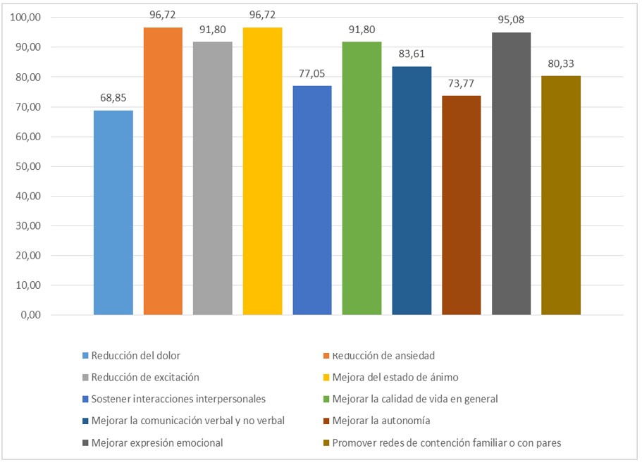 Ante la consulta sobre las posibles aplicaciones de la Musicoterapia el 96,72 % de los estudiantes consideran que es un tratamiento útil para la reducción de la ansiedad de los pacientes, así como también para la mejora de su estado de ánimo. Mientras, sólo el 68,85 % considera sus aplicaciones en el tratamiento del dolor (figura 1).