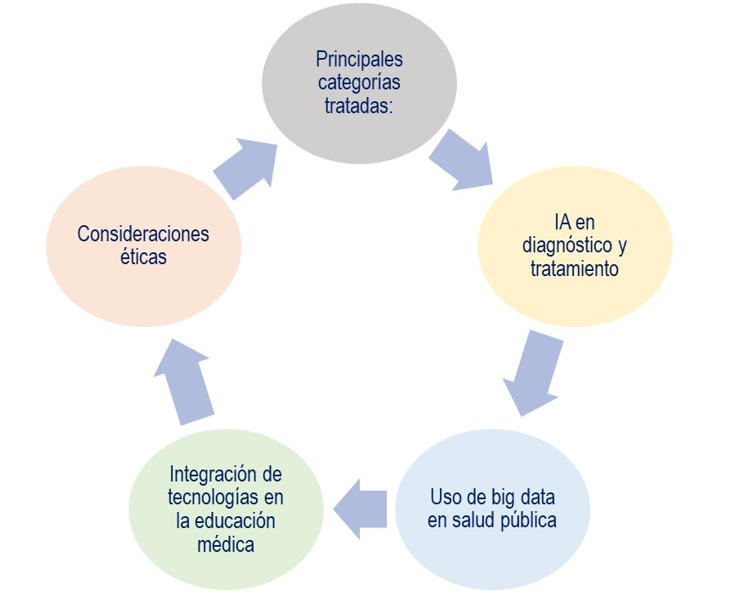 Teniendo en cuenta los aspectos declarados en el apartado Métodos y la secuencia de pasos que se siguió para identificar, procesar y socializar la información, se pudo constatar mediante el análisis a la literatura que, en las Ciencias de la Salud, la adopción de IA y big data para la investigación, trasciende simples herramientas informáticas.(8) Wiljer declara que esto genera la innovación,(9) Gómez Cano refiere la introducción de prácticas más certeras,(10) Ward afirma la personalización de tratamientos(11) y se toma la idea de Ledesma respecto a la necesidad de una formación profesional basada en competencias.(12) Además de ello, se coincide con Wan y Camacho Vargas quienes expresan que se entiende que la utilización de estas tecnologías contemporáneas y nuevos enfoques; también conduce a desafíos éticos(13) y cuidados ante su empleo inconsciente.(14) En este sentido, la figura 2 muestra un esquema que introduce la discusión sobre el tema y toma como partida los elementos declarados en el procedimiento metodológico.